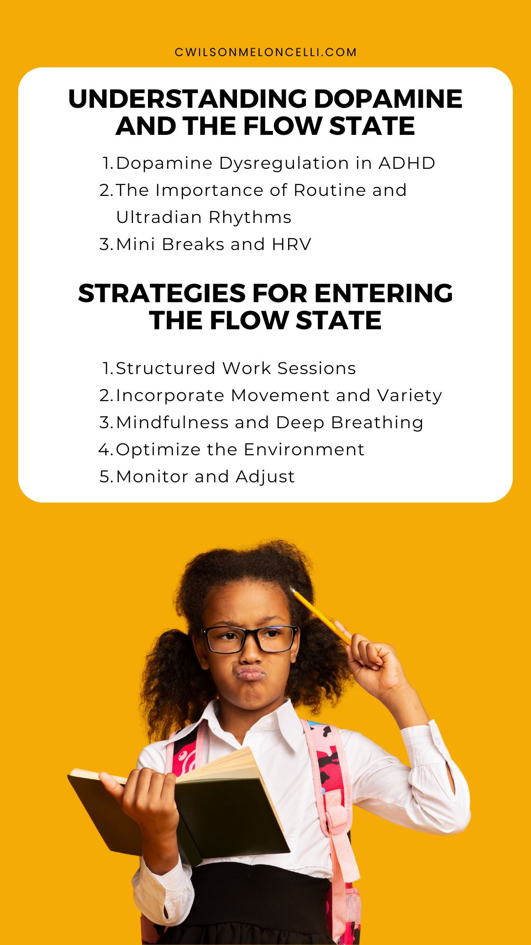Entering the flow state is not always easy, especially for individuals with ADHD. However, by understanding the role of dopamine, establishing routines aligned with ultradian rhythms, and optimizing HRV through structured breaks, individuals with ADHD can enhance their ability to access the flow state and improve overall well-being. By incorporating these strategies into daily life, individuals with ADHD can unlock their full potential and experience greater engagement, productivity, and satisfaction in their activities.